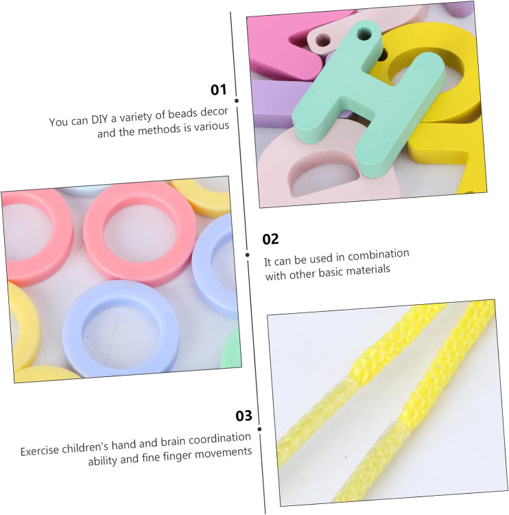 این وسیله شامل 26 مهرهی چوبی و 25 عدد مهره پلاستیکی در رنگهای درخشان و شکلهای متنوع و 2 بند بافتهی رنگی است.