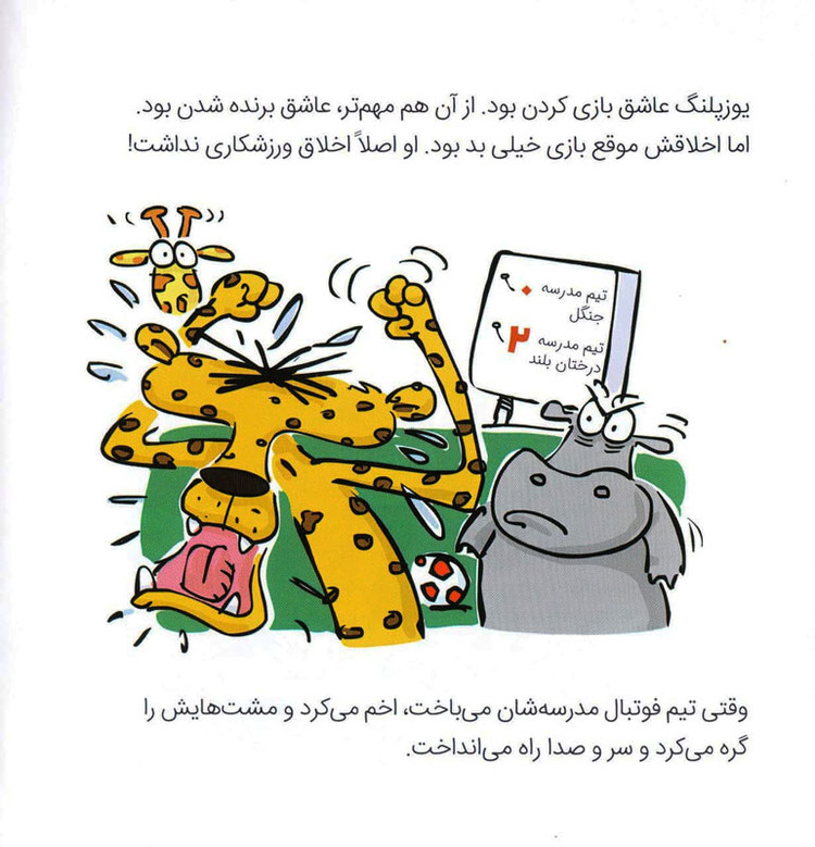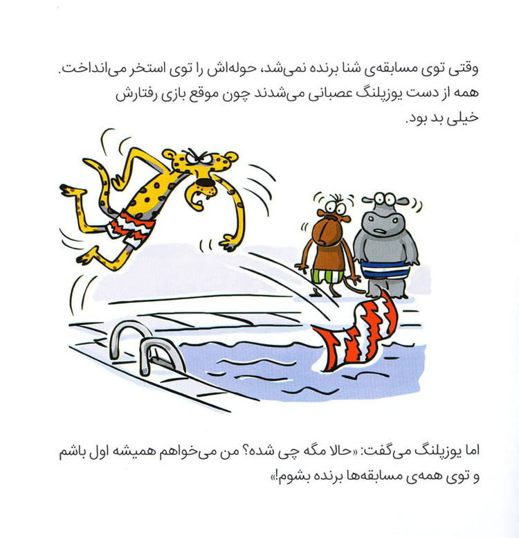 آن روز میمون و اسب آبی و زرافه و یوزپلنگ سوار اتوبوس مدرسه شدند تا به اردو بروند. قرار بود توی جنگل مسابقهای برگزار شود. برای همین آقای تمساح کرنومترش را درآورد تا ببیند چهکسی رکورد را میشکند و برنده میشود. مسابقه سخت بود و هرکدام از حیوانات در عبور از یکی از قسمتها دچار مشکل شده بودند… بچهها چشمتان روز بد نبیند. چون پوزپلنگ با اینکه میتوانست به دوستانش کمک کند، هیچ کمکی به آنها نکرد. وسط همهی این اتفاقات، «یوزپلنگ هرطور شده می خواست برنده شود»! به نظر شما این رفتار درست است؟ بچهها اگر شما با یوزپلنگ دوست بودید، از رفتارش ناراحت میشدید یا همچنان به مسابقه دادن با او ادامه میدادید؟