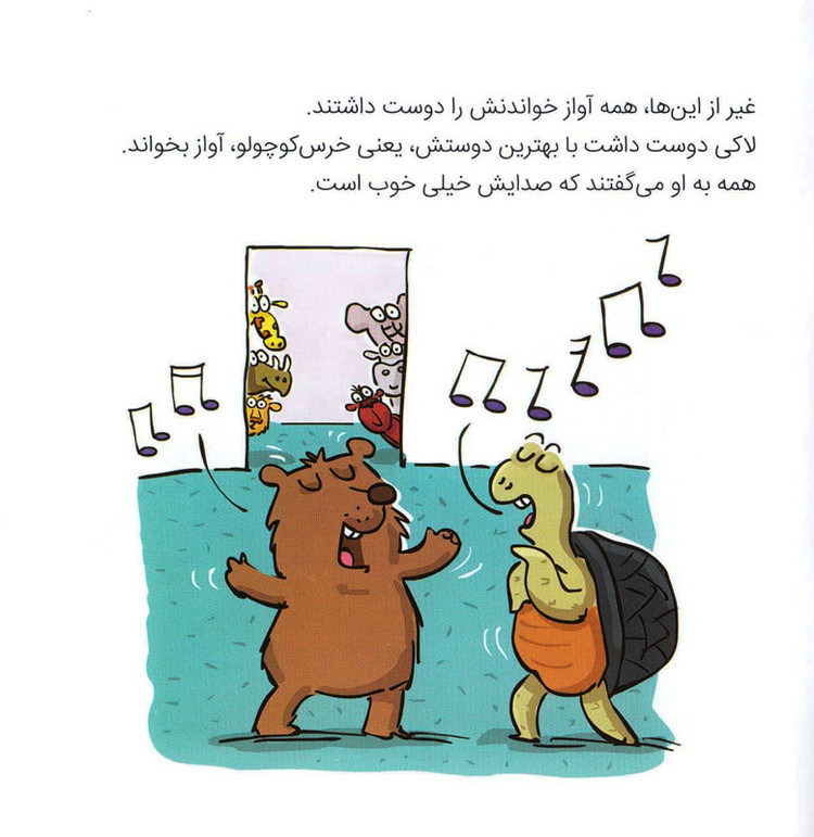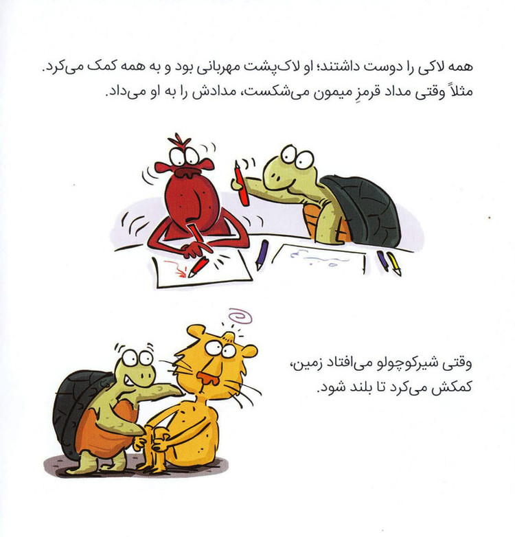 لاکی لاکپشت مهربانی بود که همه دوستش داشتند. چون او به همه کمک میکرد. مثلاً وقتیکه شیرکوچولو میافتاد زمین، کمکش میکرد تا بلند شود. وقتی مداد قرمزِ میمون میشکست، مدادش را به او میداد. غیر از اینها، همه آواز خواندنش را دوست داشتند. لاکی دوست داشت با بهترین دوستش، یعنی خرس کوچولو، آواز بخواند. همه به او میگفتند که صدایش خیلی خوب است. با وجود همهی اینها، لاکی خجالت میکشید که سر کلاس جواب سؤالات خانم معلم را بدهد. یا حتی به دیگران سلام کند… تا اینکه یک روز خانم معلم اعلام کرد قرار است مسابقهی استعدادیابی در مدرسه برگزار شود. هرکدام از بچهها برنامهای داشتند اما لاکی… او خجالت میکشید توی مسابقه شرکت کند. به نظر شما در نهایت، «لاک پشت دیگر خجالت نمی کشد» و توی مسابقه شرکت میکند یا تا آخر عمر توی لاک خودش میماند؟