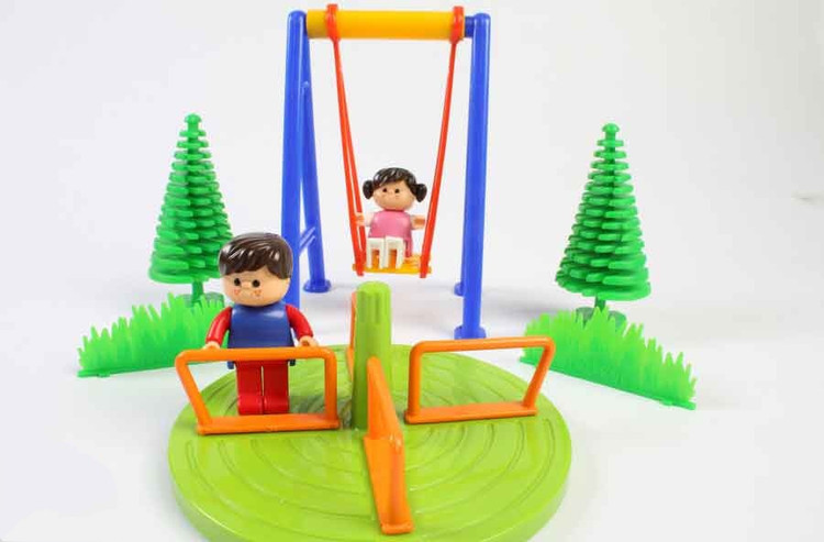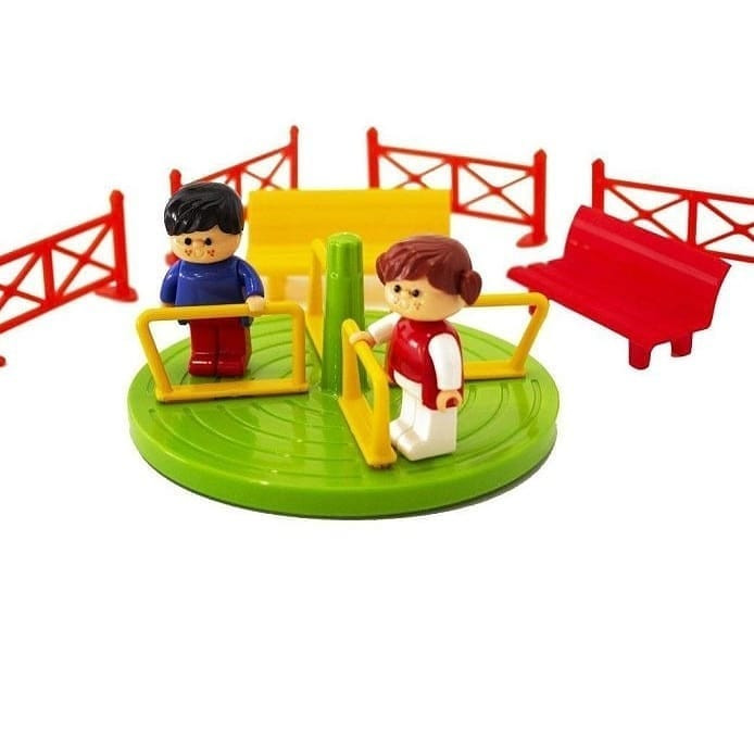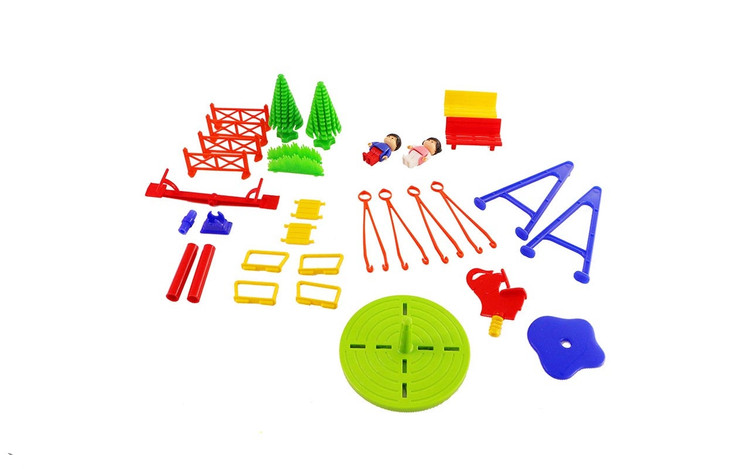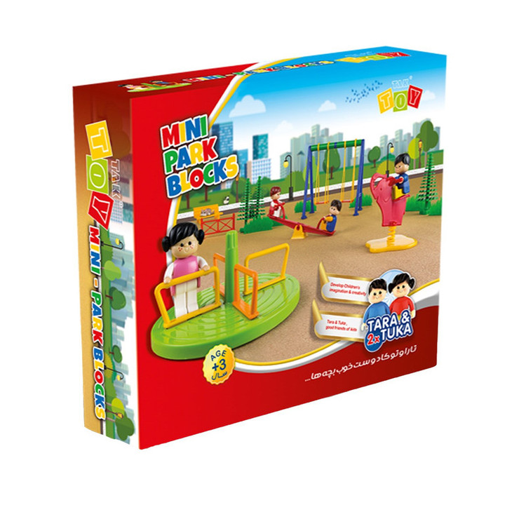 اسباب بازی مینی پارک شادی از37 قطعه مختلف تشکیل شده است که تشکیل یک پارک کوچک را میدهند و در یک بسته بندی جعبه قرار گرفته است . کودک می بایست قطعات این پارک شادی را با توجه به طرح روی جعبه سرهم کند. کودک می تواند وسایل متنوع این پارک شادی را با خلاقیت خود چیده و عروسکها را بر بازی های پارک شادی سوار کند. دست و سر عروسک ها قابل انعطاف و چرخش بوده و با زاویه های مختلف قابل تنظیم است.