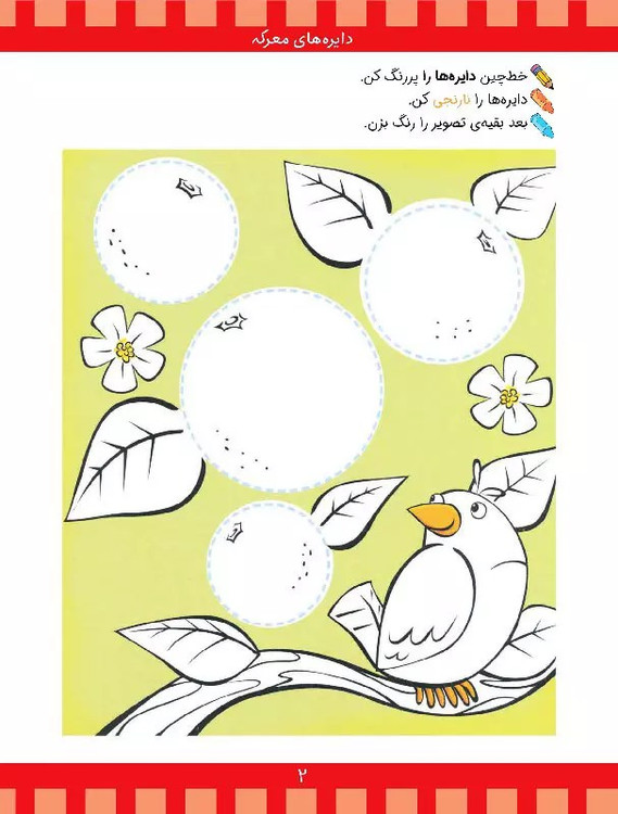 خوب دقت کنید: چند دایرهی روی شاخههای درخت شبیه پرتقالهای آبدار نیستند؟ با پررنگ کردن خطچینها، ابتدا یک دایره بکشید و بعد پرتقالهایتان را با رنگ نارنجی رنگآمیزی کنید. حالا نوبت رنگ کردن شاخوبرگهای درخت و پرندهی کوچکی است که به شما نگاه میکند.
