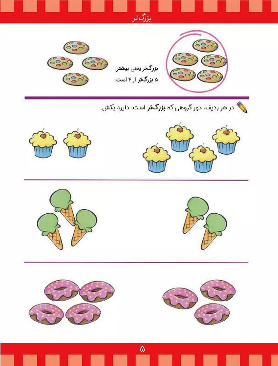 در کتاب «شناخت مفاهیم پایه ۱»، کودک با مفاهیمی همچون تساوی، کمتر و بیشتر، بزرگتر و کوچکتر، شباهت و تفاوت، کامل و ناکامل آشنا میشود. برای مثال، او از بین تصاویر خوکها و خرگوشها باید مواردی را انتخاب کند که از نظر تعداد با یکدیگر مساویاند. در صفحهای دیگر، شیرینیهای خوشمزه و دوناتهای رنگارنگی وجود دارد و کودک در هر ردیف، باید دور شکل بزرگتر یا به عبارتی تعداد بیشتر خوراکیها را خط بکشد. در صفحهی بعدی سه گربه، سه هشتپا، سه جغد و سه شترمرغ دیده میشود. در هر دسته، دو جانور شبیه به هم و یکی از آنها متفاوت است که کودک با کشیدن دایره به دور گزینهی متفاوت آن را از بقیه متمایز میکند. در ادامهی کتاب، مفاهیم اندکاندک پیچیدهتر خواهند شد.