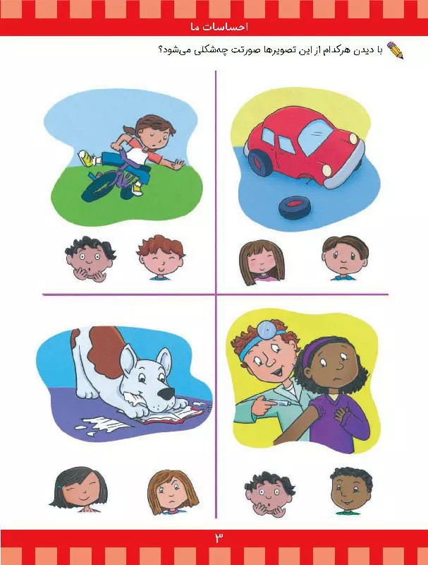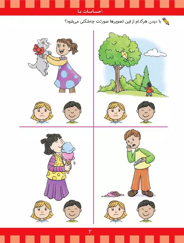 در کتاب «شناخت مفاهیم پایه ۲»، کودکان با شناخت احساسات از طریق چهره، به خاطر سپردن تصاویر مشابه، مفاهیمی همچون بو کردن، مزه کردن، لمس کردن و شنیدن، آشنایی با شغلها و ابزار آنها و… آشنا میشوند؛ برای مثال، کودک باید مفاهیم متضاد را از بین تصاویر یک صفحه تشخیص دهد و آنها را دو به دو به یکدیگر وصل کند. مثلاً با وصل کردن دو لیوان پر از آب و خالی به یکدیگر، با مفهوم پر و خالی آشنا میشود. در صفحهای دیگر، افرادی را در لباس مشاغل گوناگون میبیند که باید هریک را به ابزارهایشان مرتبط کند. تشخیص غذاهای سالم از ناسالم یکی دیگر از فعالیتهای این کتاب است. در ادامهی کتاب، مفاهیم اندکاندک پیچیدهتر خواهند شد.