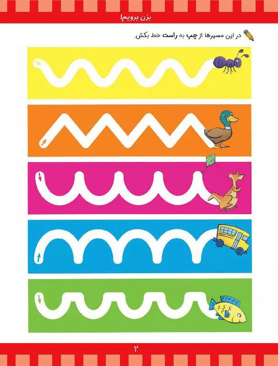 در کتاب «مهارت نوشتن» قرار است بچهها یکعالمه خط راست، پیچدرپیچ، زیگزاگی و حتی کجوکوله بکشند. در صفحات ابتدایی کتاب، همستری کوچک میخواهد از لولهای پیچپیچی رد شود و به دوست خودش در انتهای آن برسد. اما چطوری؟ در صفحهای دیگر یک مریخی میخواهد با سفینهی فضاییاش از سیارات گوناگون گذر کند. یک دلفین آبی قشنگ توی دریا شیرجه زده است و مسیری پرپیچوخم را شنا کرده است. خرگوش کوچکی یک هویج را از دل خاک درآورده، آن را دستش گرفته و جستوخیزکنان توی باغچه بالا و پایین میپرد. حتی مسیر پرواز پرنده در آسمان هم مشخص شده است. در تمام این موارد، کودک تمرین میکند در جاهای مشخصشده خطوط منحنی و قوسدار یا پرچینوشکن بکشد. در حقیقت، این شیوه نوعی دستورزی برای کودک است تا بدین طریق در دست گرفتن مداد و نوشتن را تمرین کند.