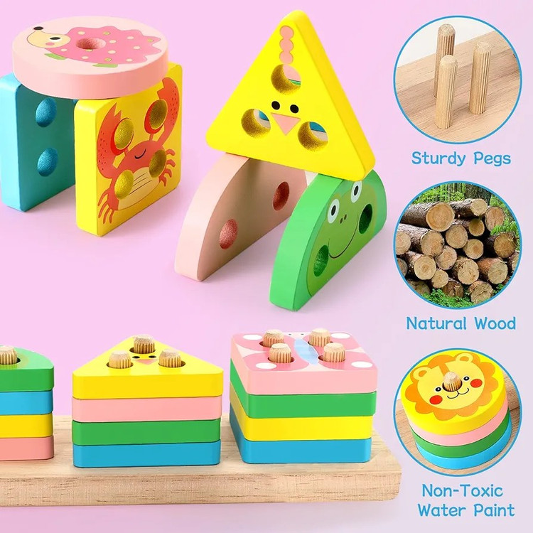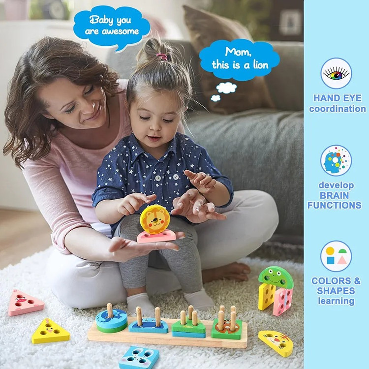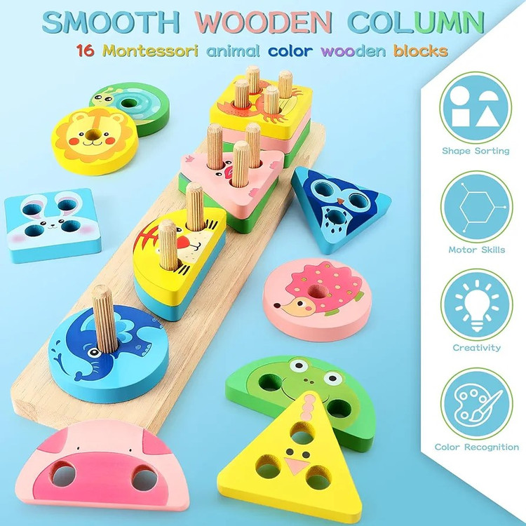 بازی پایه اشکال مونته سوری مدل حیوانات از جنس چوبی است. و رنگ های به کار رفته در این محصول ، بدون ضرر می باشد. مزیت این بازی نسبت به بازی های مشابه به کاربردن طرح حیوانات روی قطعات است که کودک را به خود جذب می کند.