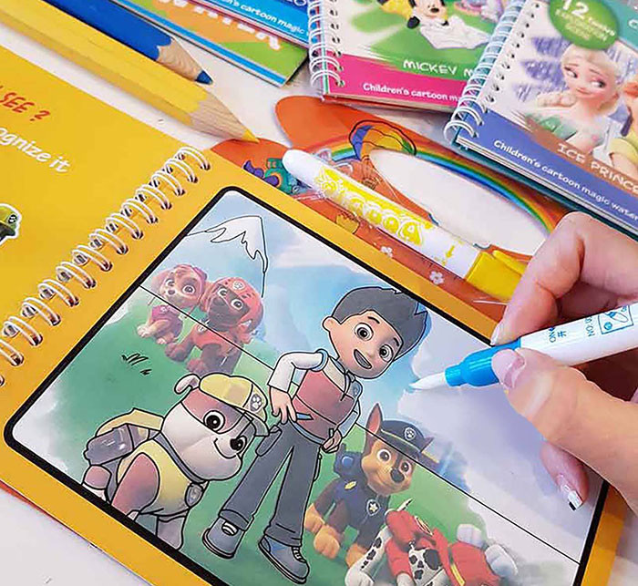 دفتر جادویی نقاشی یک سرگرمی بسیار عالی برای کودکان است که باعث افزایش مهارت رنگ آمیزی و نقاشی آنها می شود. این دفتر دارای چهار صفحه نقاشی با طرح های متفاوت است که با قلم مخصوص خود باید رنگ آمیزی شود. رنگ آمیزی به این گونه است که داخل قلم مخصوص دفتر مقداری آب ریخته و با کشیدن قلم بر روی صفحه رنگ آن نمایان می شود و بعد از چند ساعت رنگها از بین رفته و مجددا قابل استفاده و رنگ آمیزی است. میتوانید آن را برای کودکان 1 تا 5 سال خود تهیه کنید.