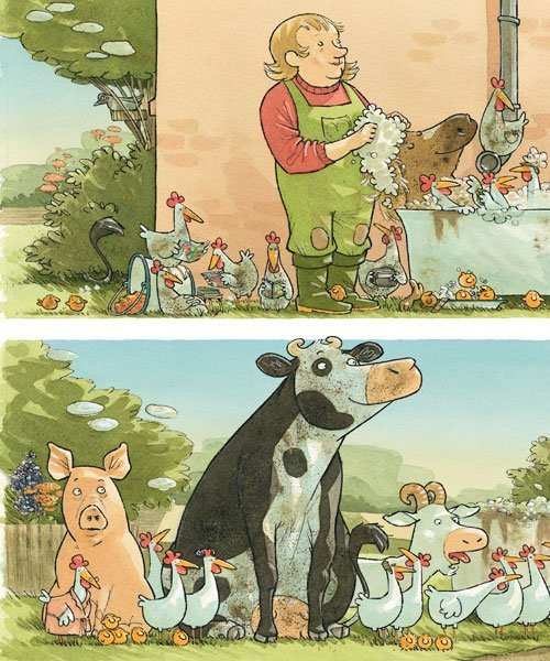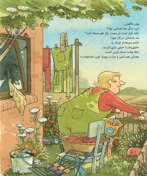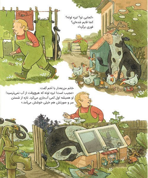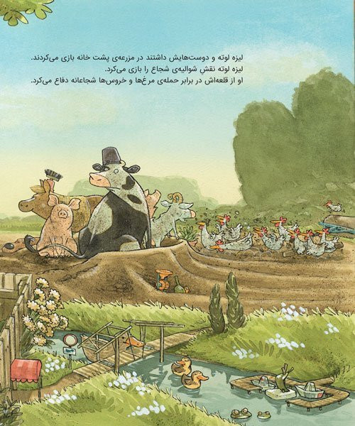لیزهلوته شوالیه شده بود و با مرغها و خروسها بازی میکرد. او حسابی خاکوخُلی و کثیف شده بود. خانم مزرعهدار داد زد: «بازی دیگر بس است! وقت حمام کردن است!» همهی حیوانات مزرعه حمام کردند و تر و تمیز و دستهگل شدند. پس لیزهلوته کو؟ لیزهلوته اصلاً دلش نمیخواست حمام کند. البته خانم مزرعهدار هم اصلاً دلش نمیخواست لیزهلوته کثیف و چرکولک باشد.