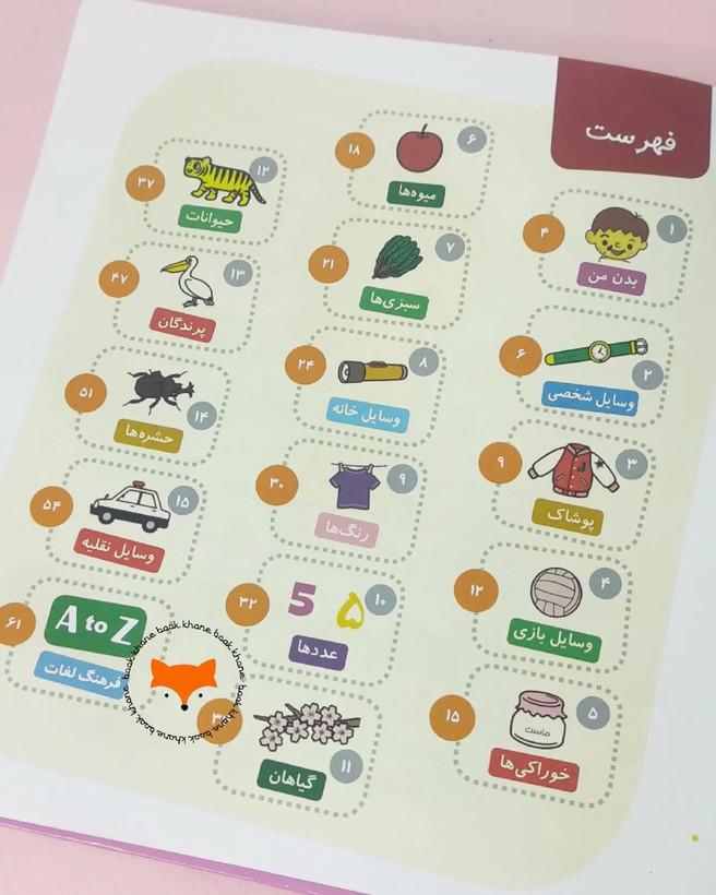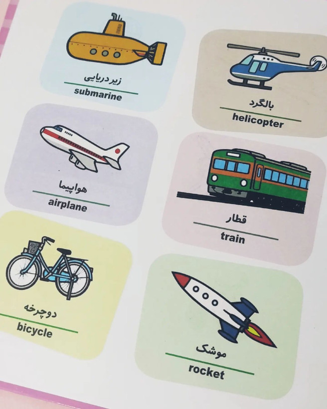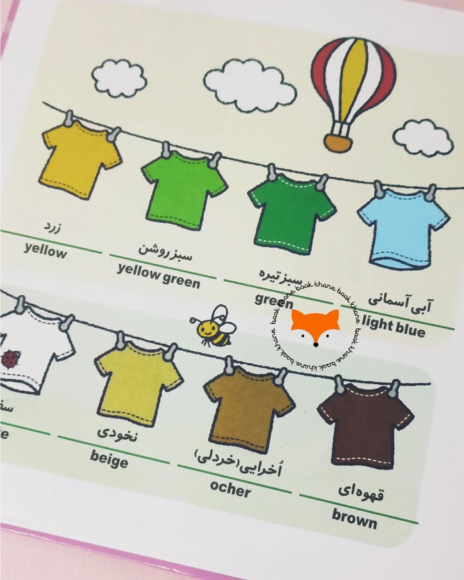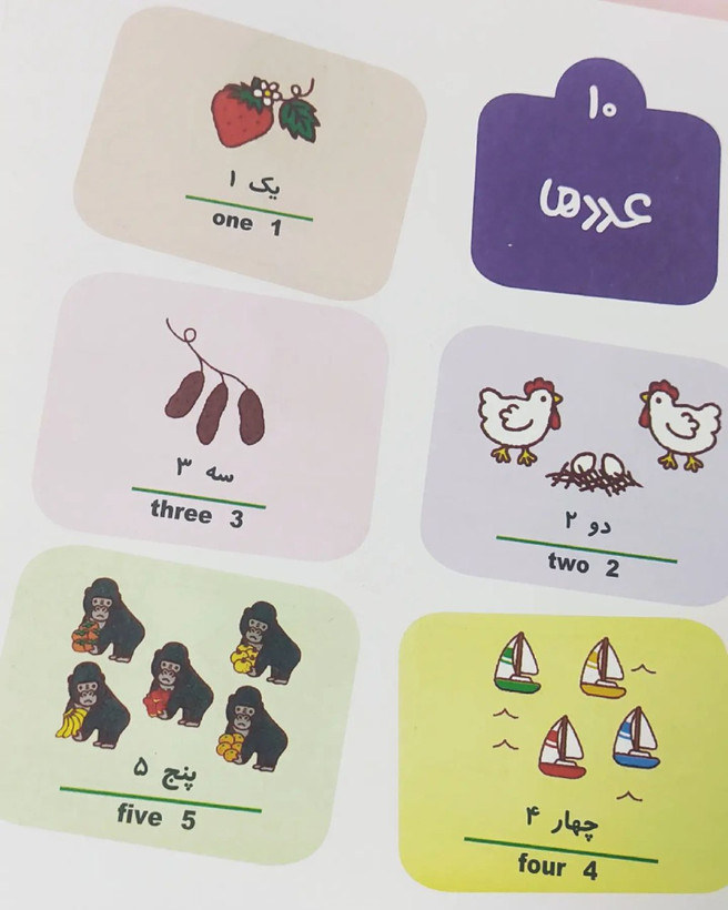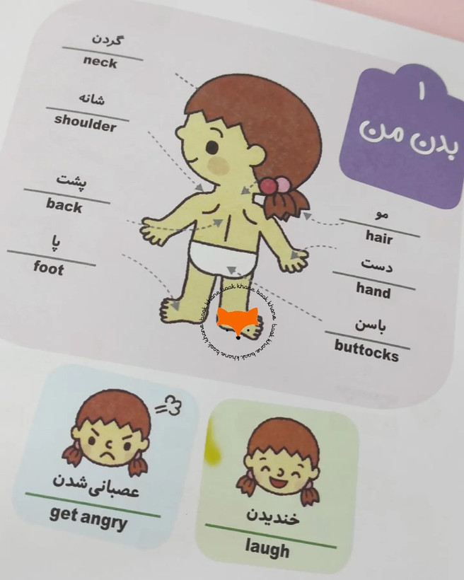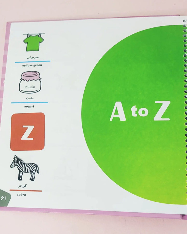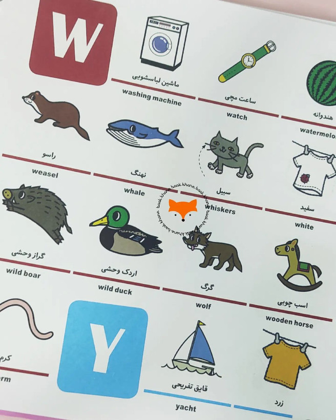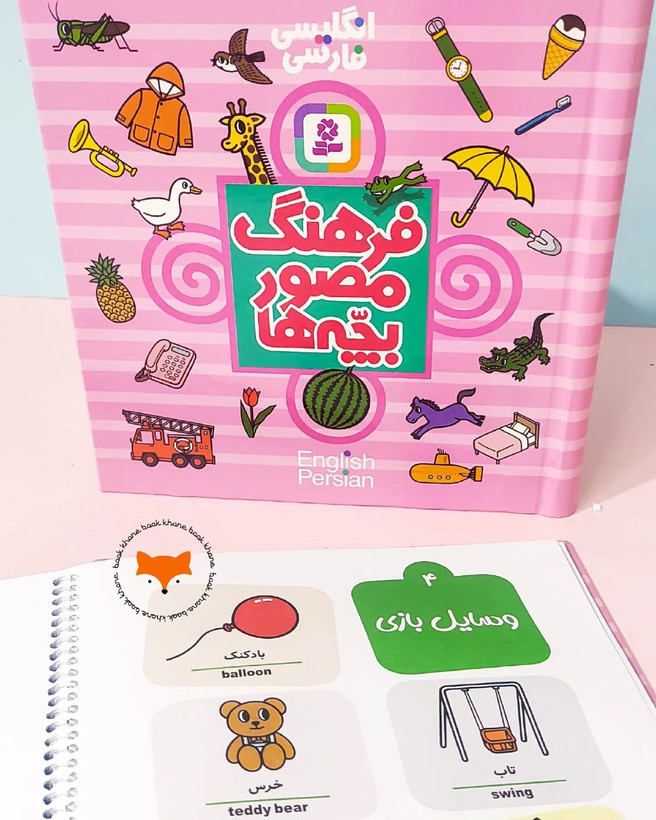 در این کتاب مجموعه از کلمات به زبان فارسی و انگلیسی به کودکان آموزش داده شده است