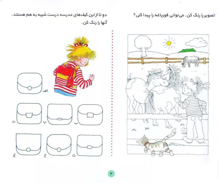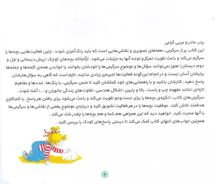موضوعاتی چون رنگها، عددها، مفهوم چپ و راست، بالا و پایین، اشکال هندسی، تفاوتهای زندگی جانوران و… در این کتاب در قالب سرگرمی آموزش داده میشود.