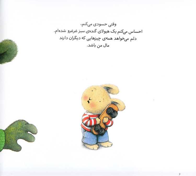 در «خرگوش کوچولوی حسود» میفهمیم که خرگوش کوچولو وقتی حسودی میکند، انگار یک هیولای سبز بزرگ است. این احساس باعث میشود او به همهی چیزهایی که ندارد و همهی کارهایی که بلد نیست، فکر کند و ناراحت شود. خیال میکند دیگران خیلی چیزها بیشتر از او دارند و خیلی کارها را بلدند انجام بدهند که او بلد نیست. البته گاهی وقتها واقعا همینطور است و گاهی وقتها نه. حتی بعضی اوقات دیگران به او حسودی میکنند.
