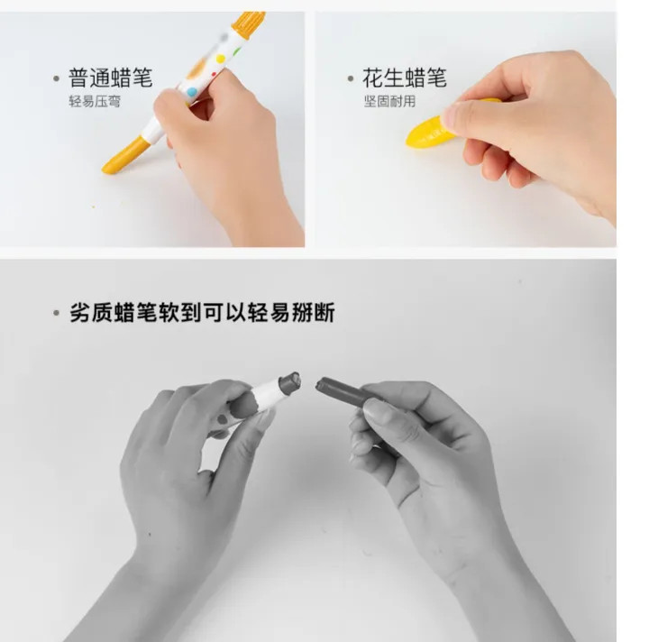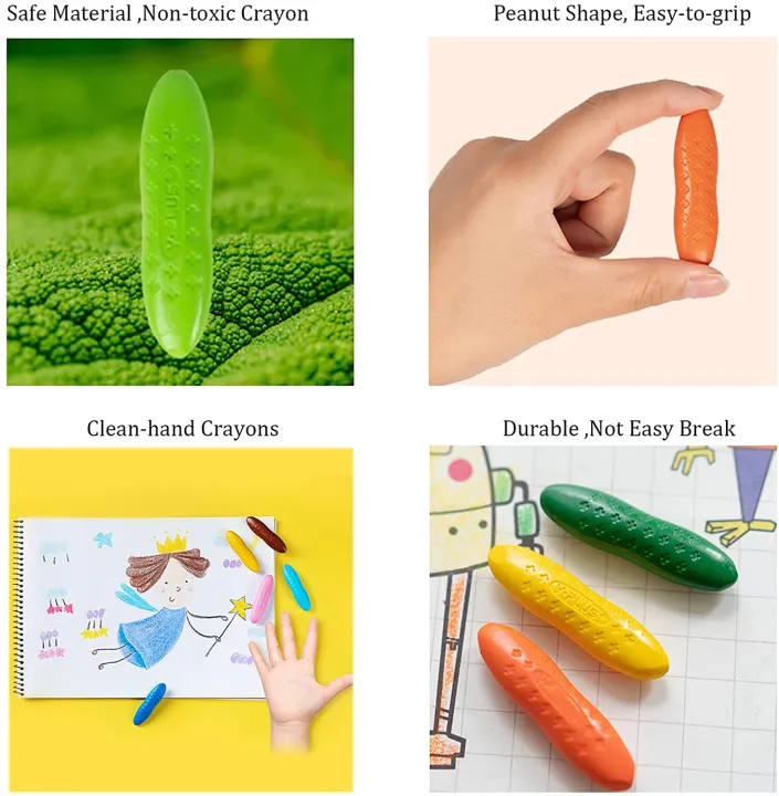 این مداد شمعی ها به شکل بادام زمینی طراحی شده است و به علت داشتن فرو رفتگی روی مداد شمعی ، کودکان به راحتی می توانند در دست گرفته و نقاشی کنند.