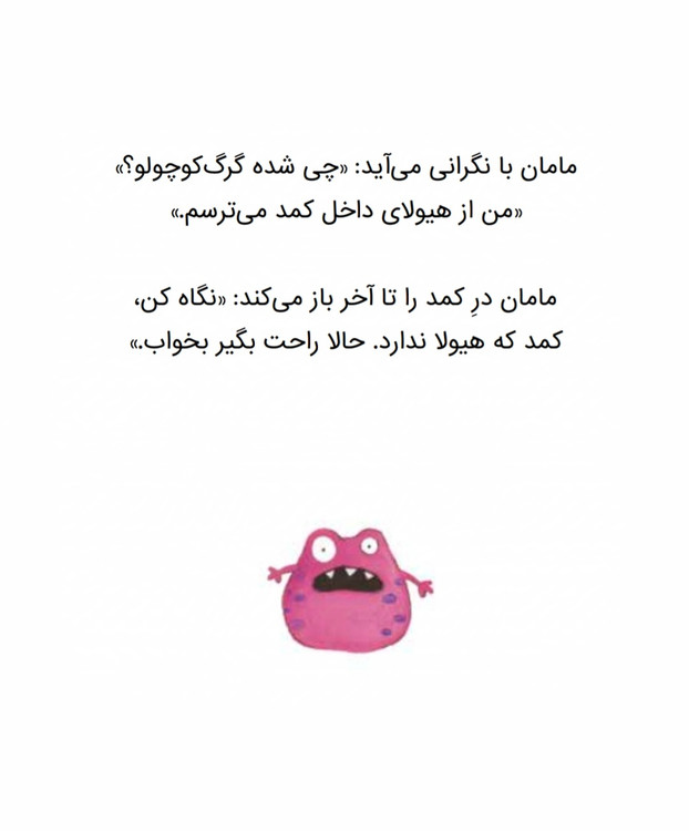 در قصهی این جلد گرگ کوچولو به تختخواب میرود و میخواهد بخوابد. اما اتاقش تاریکِ تاریک شده است!