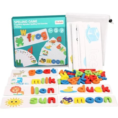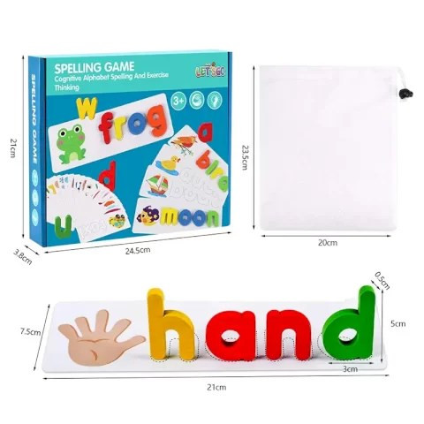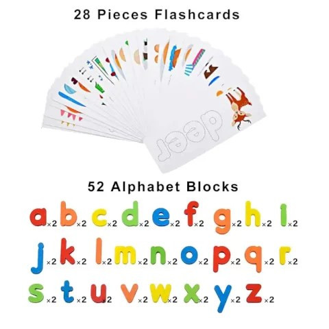این پازل چوبی دارای 52 قطعه حروف الفبای انگلیسی چوبی جذاب و رنگی رنگی هست و در کنار اون 28 عدد فلش کارت های دو رو هست که توی اون تم های مختلفی مثل :
