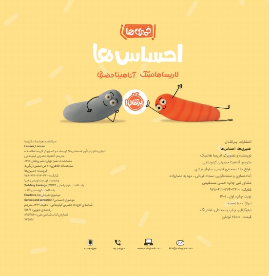 در کتاب «احساس ها»، کودکان با کمک خمیریهای رنگارنگ، میتوانند با احساسات و هیجانات گوناگون و البته رنگها آشنا شوند و واژههای جدیدی برای نامیدن احساساتشان بیاموزند.