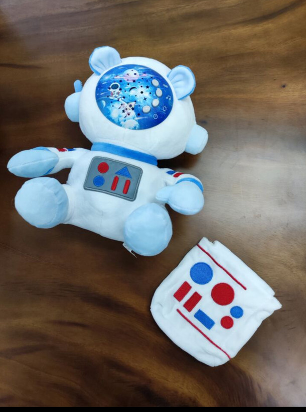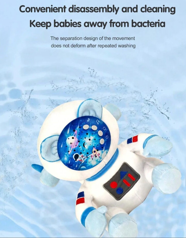 این چراغ خواب با ظاهر جذاب فضانورد، نهتنها یک وسیله نورپردازی بلکه یک عنصر دکوراتیو برای اتاق کودک است. نورهای رنگی چرخان با افکتهای ستارهای، حس خیالپردازی و آرامش را در فضای خواب ایجاد میکنند. موسیقی ملایم نیز به خواب راحت کودک کمک میکند.