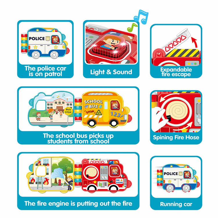 این کتاب با دکمههای موزیکال و صدای واقعی مثل آژیر آتشنشانی، صدای آمبولانس، ابزار نجاری یا صدای آشپزخانه، تجربهای چندحسی برای کودک فراهم میکنه. جنس صفحات ضخیم و مقاومه و طراحی آن برای استفاده مستقل کودک کاملاً ایمن و جذابه.