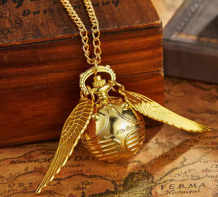 ساعت گردنبندی گوی زرین با طراحی بالدار و الهام از گوی طلایی کوییدیچ، یکی از نمادهای محبوب دنیای هری پاتر است. این ساعت جیبی با درب تاشو، صفحه سفید و زنجیر بلند، هم تزئینیه و هم قابل استفاده روزمره برای طرفداران جادوگری.