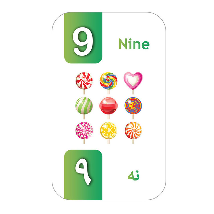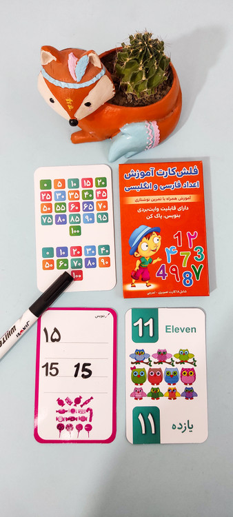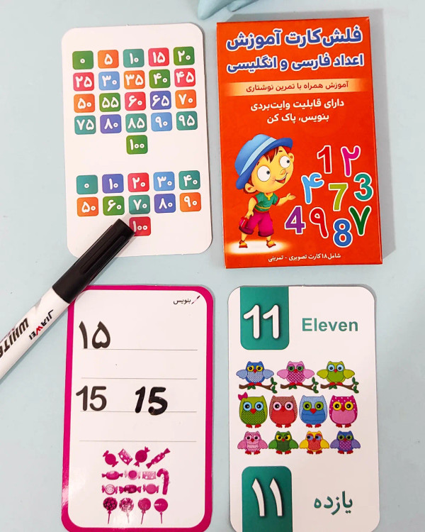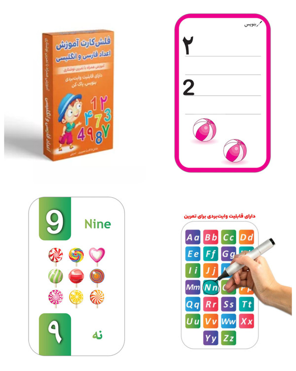 هر فلش کارت شامل آموزش شمارش اعداد فارسی و انگلیسی و همچنین تمرین نوشتاری اون عدد می باشد