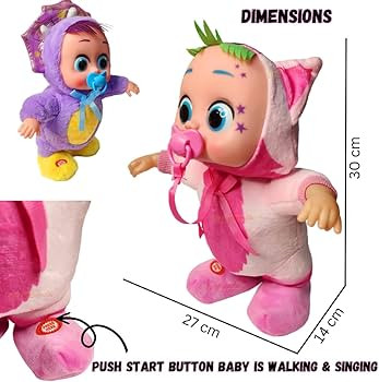 عروسک بیبی کرای با ارتفاع ۳۰ سانتیمتر، طراحی شده با لباس حیوانی رنگی، چشمان درشت و پستانک، یکی از محبوبترین اسباببازیهای موزیکال برای کودکان خردسال است. با فشردن دکمه روی پا، عروسک شروع به راه رفتن و آواز خواندن میکند.