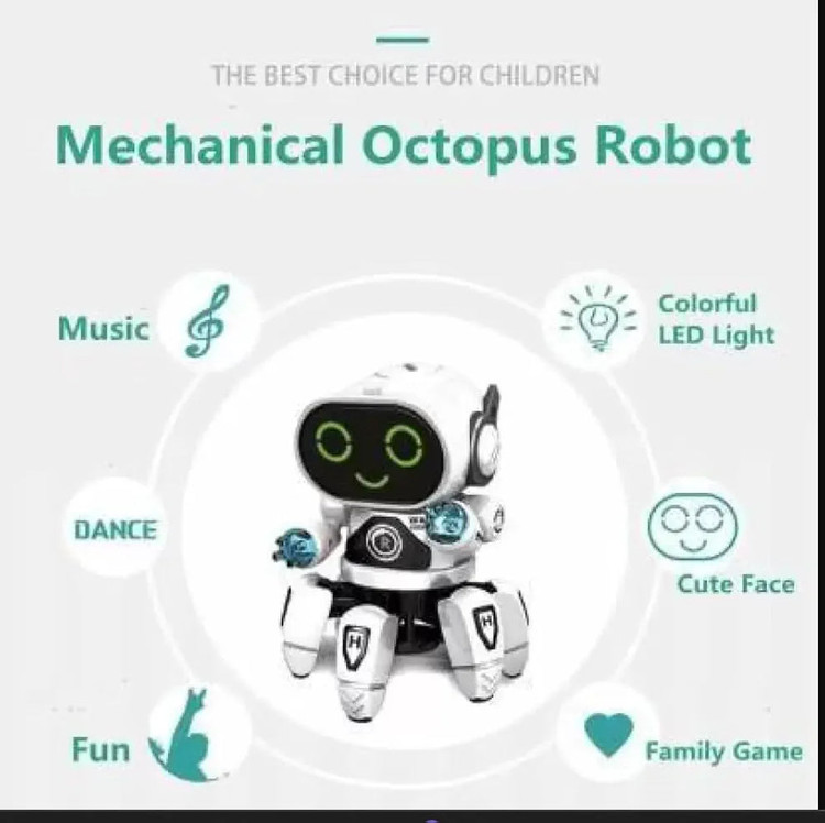 ربات هشتپا موزیکال یک اسباببازی هوشمند و جذاب برای کودکان ۳ سال به بالا است که با طراحی فانتزی، نورپردازی رنگی، افکتهای صوتی و قابلیت حرکت، تجربهای سرگرمکننده و آموزشی برای کودک فراهم میکند. این ربات با چهره دوستانه، چشمهای LED و نور سبز روی سینه، کودک را به تعامل و بازی دعوت میکند.
