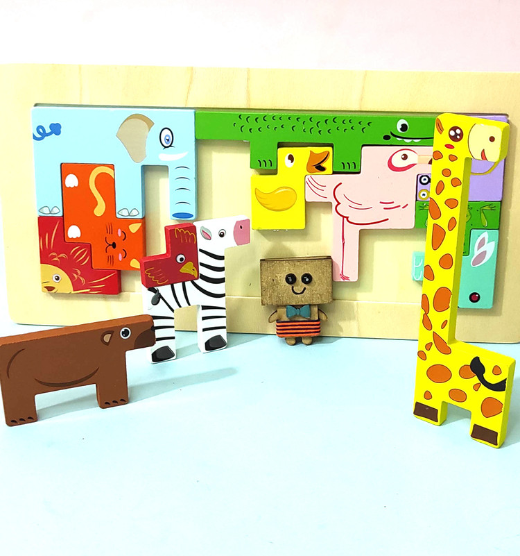 بازی فکری تتریس چوبی حیوانات یک بازی بسیار عالی برای تقویت مهارت حل مساله برای کودکان بالای سه سال است. این بازی چالشی ابتدا با رویکرد آزمون و خطا کودک را با نتیجه ی انتخاب هایش آشنا می کند. در این بازی کودکان با جاگذاری حیوانات چوبی رنگی در حالت های مختلف می بایست قاب چوبی را پر نمایند به گونه ای که هیچ قطعه ای اضافه نیاید و هیچ جای خالی هم بین قطعات باقی نماند.