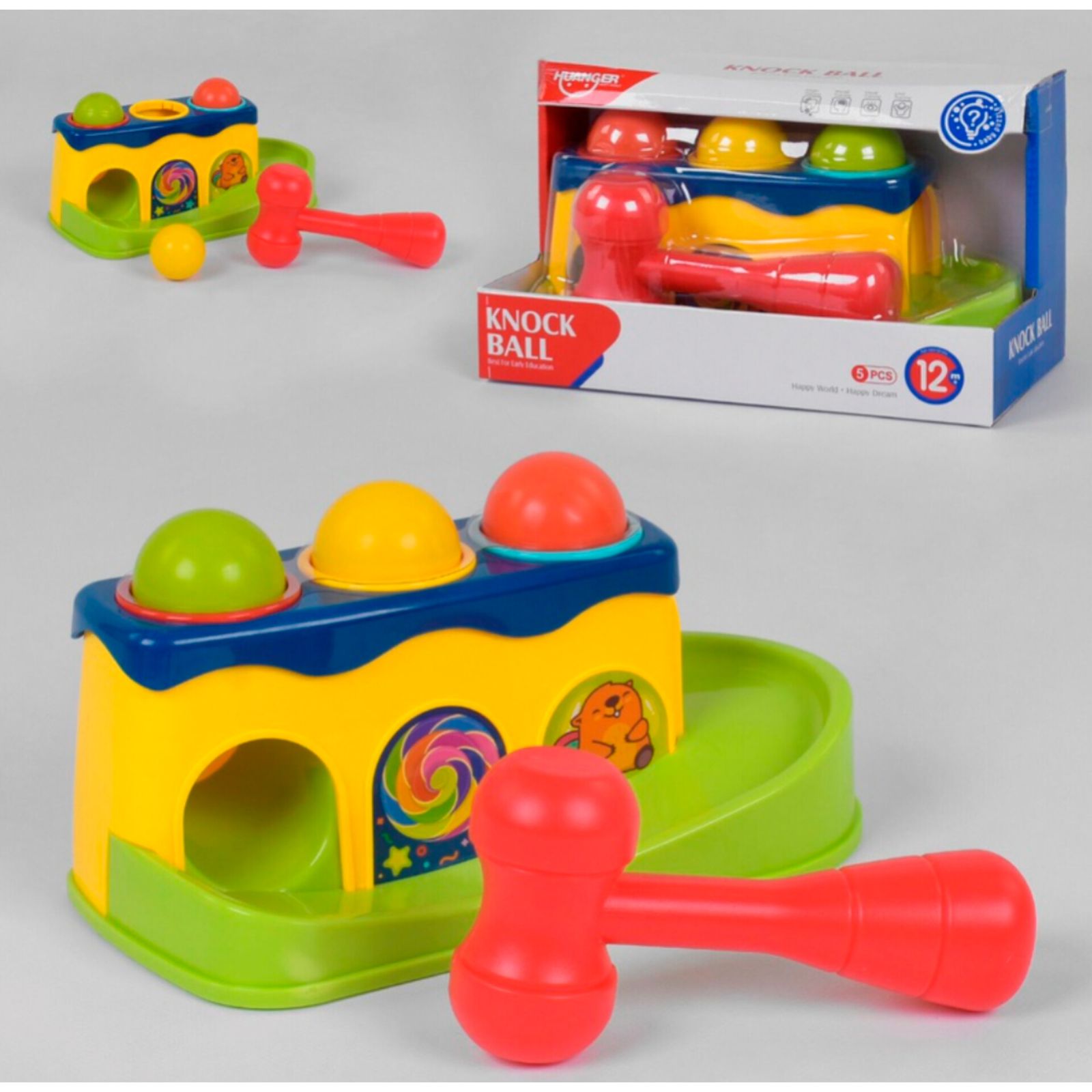 این محصول از پلاستیک باکیفیت و ایمن ساخته شده و دارای سه توپ رنگی (سبز، زرد و قرمز)، یک چکش سبک و پایه محکم با طراحی کودکانه است. رنگهای شاد و طراحی جذاب باعث میشود کودک بارها و بارها به بازی با آن ترغیب شود.