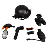 تجهیزات و اقلام همراه : دوربین دوچشمی قابل نصب روی کلاه،بیسیم هدفونی با میکروفون جلوی دهان،تیر پرتابکن نصبشونده روی کلاه دو عدد تیر پلاستیکی،نشانهگیر چشمی تیرپرتابکن چراغقوه قابل نصب روی کلاه