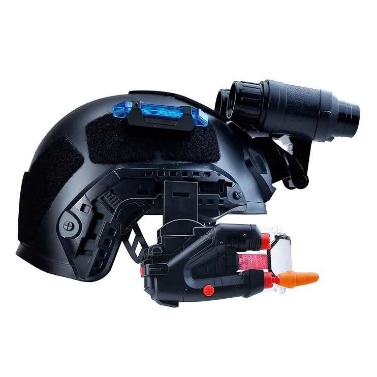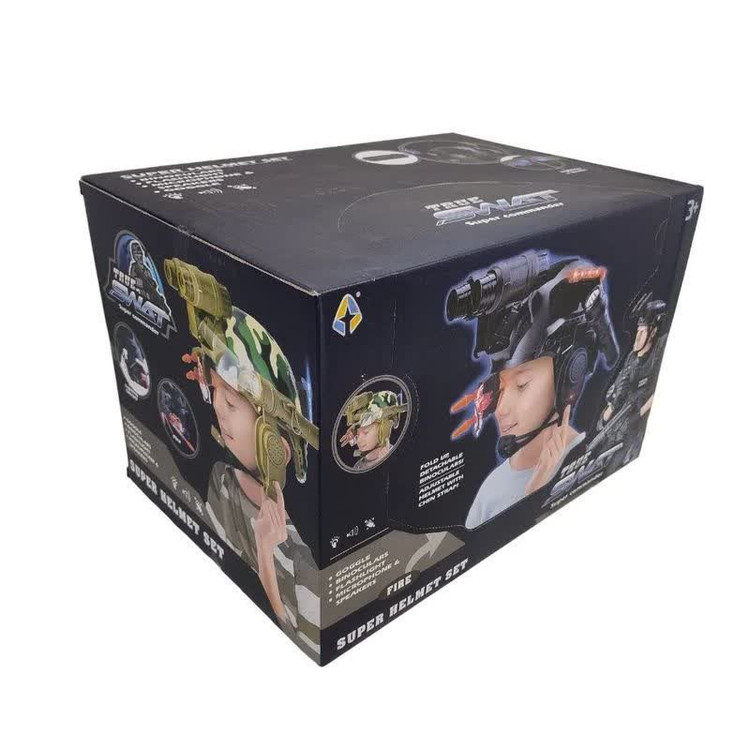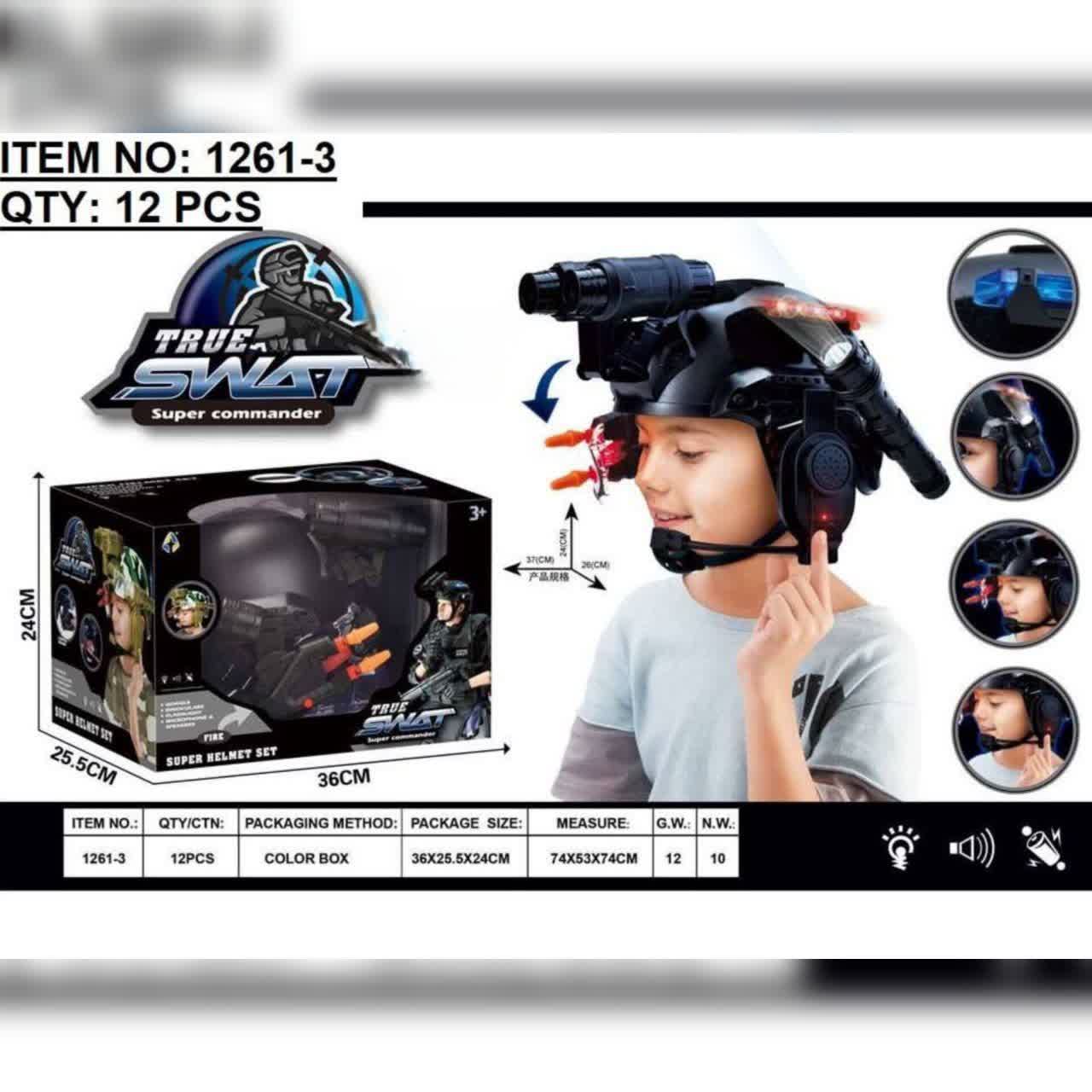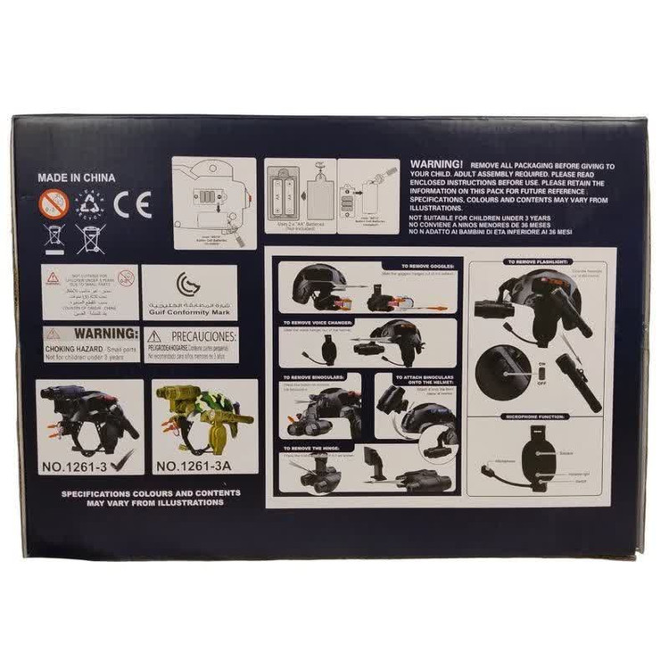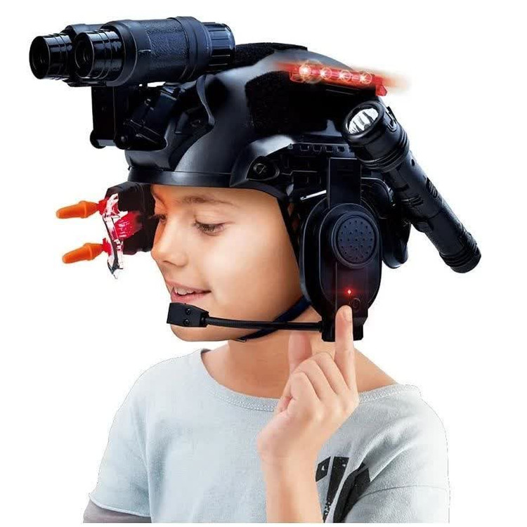 عملکرد های کلاه نظامی کودک: قابلیت پرتاب تیر با دکمه،دوربین با امکان حرکت بالا و پایین بدون برداشتن کلاه،میکروفون اسپیکردار متصل به بیسیم،چراغقوه با کلید روشن/خاموش،چراغهای هشدار با 3 حالت نورپردازی