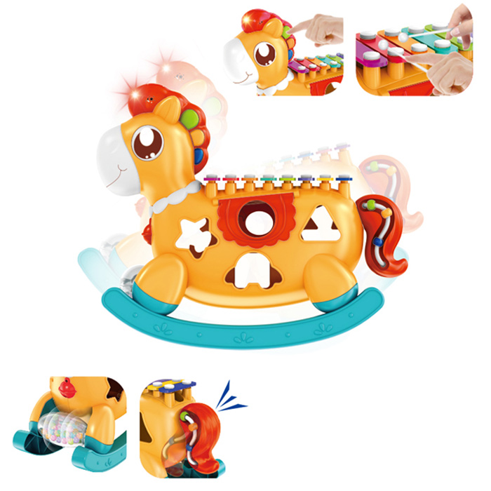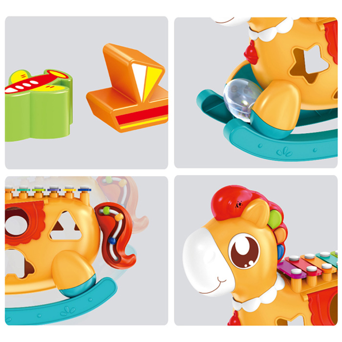 مشخصات محصول موزیکال و چراغدار ،به همراه باز و جغجغه ،و پازل جایگذاری اشکال ،بع همراه کارت نوت برای نواختن ملودی های مختلف