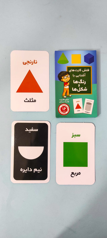 شامل16 عدد فلش کارت جهت آموزش انواع شکل ها و رنگ ها به کودک می باشد پشت فلش کارت ها جهت تمرین رسم شکل ها برای کودک است